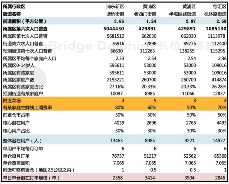 也就是说,在当下辐射几个人口密度较高街道的前置仓,其潜在单日订单规模在 2500-3500 单区间。一二线城市整体平均水平若在这个基础上打个 8 折的话,对应 2000-2700 单。