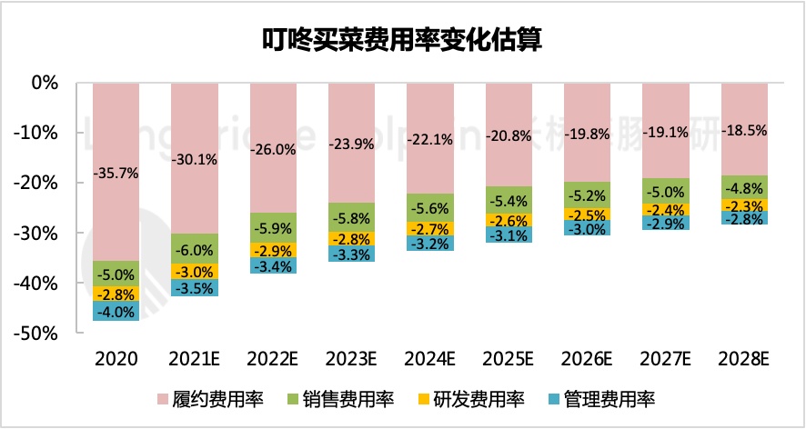 假设毛利率随高利润品 SKU 的引入,从 2020 年 19% 缓慢攀升至 30%。履约费用按照单仓 UE 模型进行估算,其他传统运营费用率随经营周期变化,整体呈缓慢降低趋势。