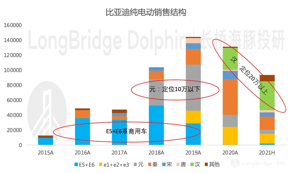 - 2019-2021 年,公司纯电动车型丰富度明显提升,主打 10-15 万元的 e 系列和秦上量,20 万以上的汉成为纯电动市场的爆款。