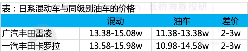 同时海豚君对比了基本垄断中国混动市场的日系车,以最畅销的丰田雷凌和丰田卡罗拉为例,其混动版本同样比油车版本贵 2-3 万,但混动车型并不能享受免购置税的优惠。
