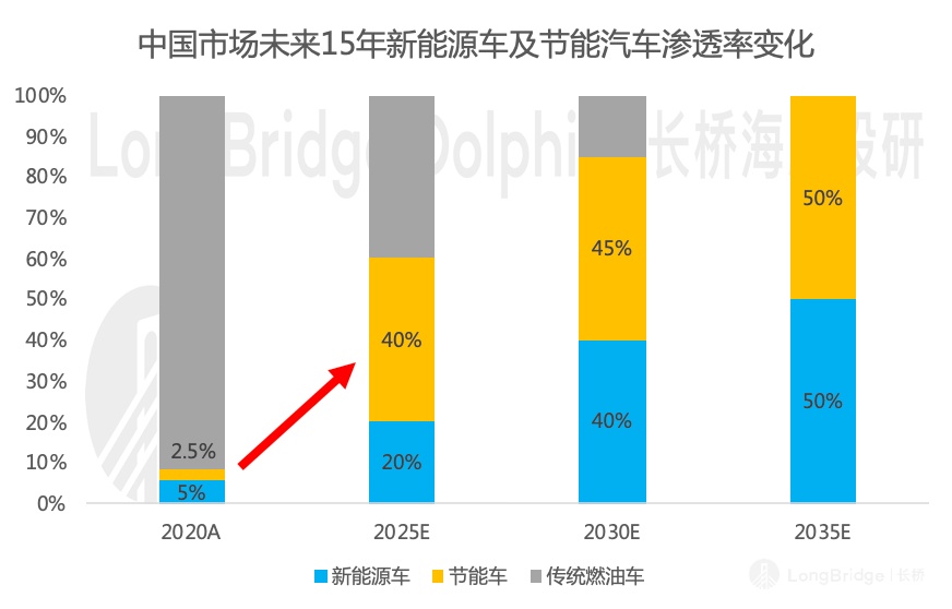 - 中国政府 2020 年发布的《节能与新能源汽车技术路线图 2.0》提出我国汽车技术的总体目标,到 2025 年、2030 年和 2035 年,国内新能源汽车分别达到总销量的 20%、40% 和 50%,节能汽车 (HEV 可以轻松完成政策对 2021-2023 年的节能要求水平) 分别达到传统能源乘用车 50%、75% 和 100%;