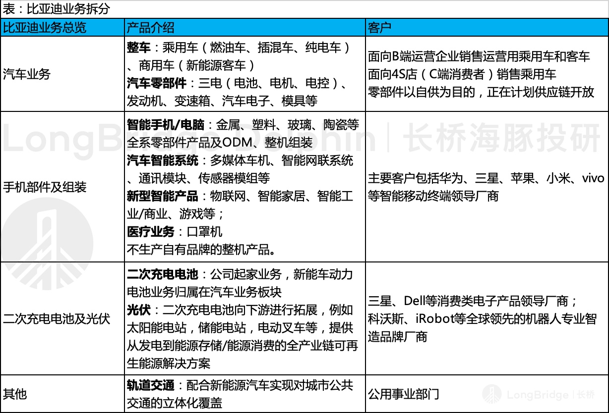 首先我们从财务数据披露的口径,来看一下比亚迪的业务分布及各业务分部具体包含哪些产品: