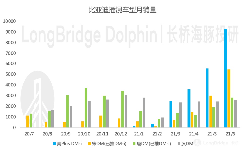 - 宋的插混车型在宋 Plus DM-i 的加持下实现 1.1 万辆的半年度销量,超 2020 年全年销量(0.8 万辆),单月销量冲上 5000 辆;