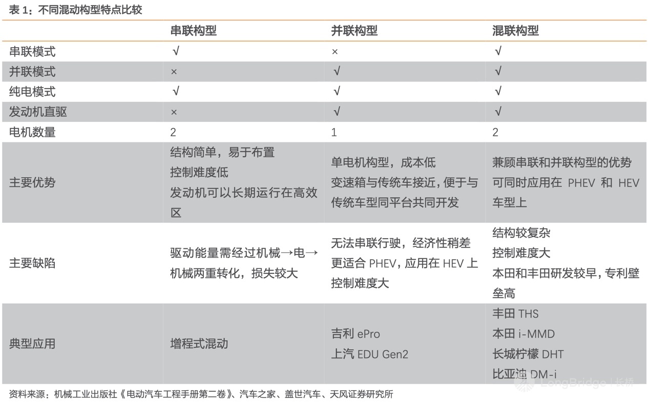 - 串并联是一种融合了上述串联和并联两种构型优点的混动构型,可兼容插混和混动,技术门槛最高,丰田和本田在中国混动市场的垄断地位就来自于对串并联的技术布局和专利壁垒。
