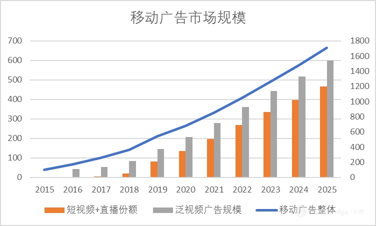 上图数据结合了哔哩哔哩香港二次上市招股书的泛视频广告市场规模,咨询机构也是艾瑞咨询。我们把橘色柱和灰色柱合并可以看出短视频 + 直播是视频广告的增长贡献者,站泛视频广告份额从 2016 年的 4% 上升到 2025 年的 78%,占比一直在增加。短视频 + 直播广告的效果和 ROI 毋庸置疑,没有商家可以承担不在短视频平台投广告的机会成本。短视频 + 直播广告的规模将在 2025 年达到 4650 亿,CAGR 在 33.7%(对比泛视频整体广告规模 5985 亿,CAGR26.5%)