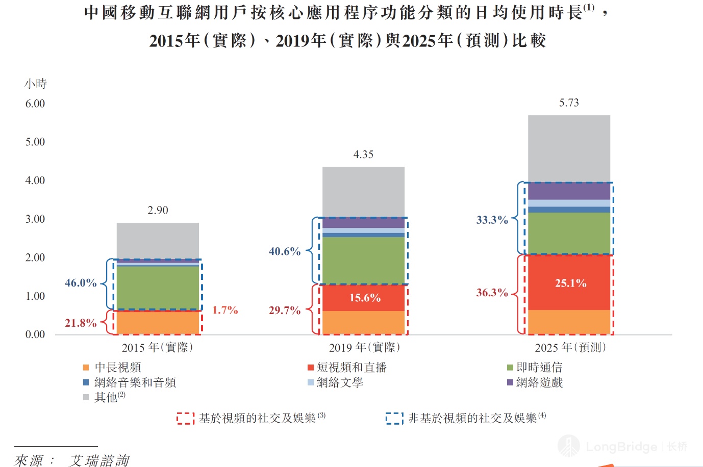 根据上图艾瑞咨询在快手 IPO 招股书上的第三方预测,首先移动互联网的屏幕时间会持续增长(其实 CAGR 对比 2015-2019 的五年间没有放缓多少)短视频 + 直播将持续抢占其他应用的屏幕时间(主要是抢占微信的屏幕时间)也是移动端增长最快的赛道。