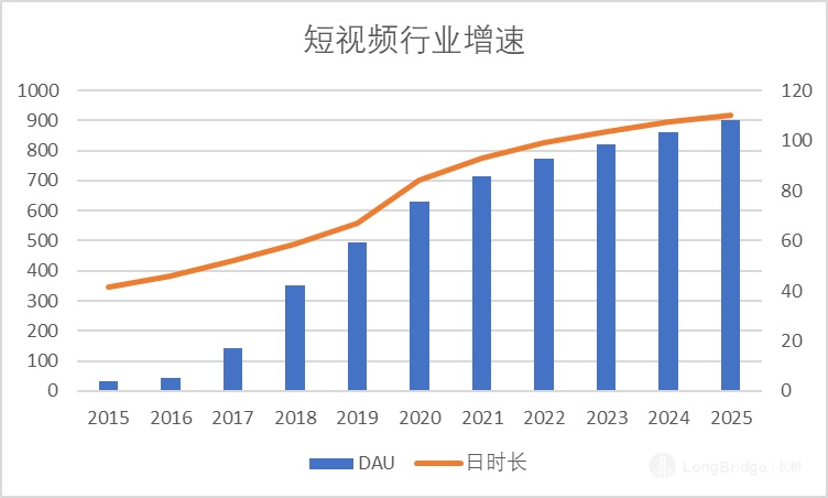 现在到 2025 年的 DAU 可以维持 10.4% 的 CAGR,日时长维持约 8.6% 的 CAGR。也就是说两者相乘,短视频内容消费量可以达到约 20% 的高增速。