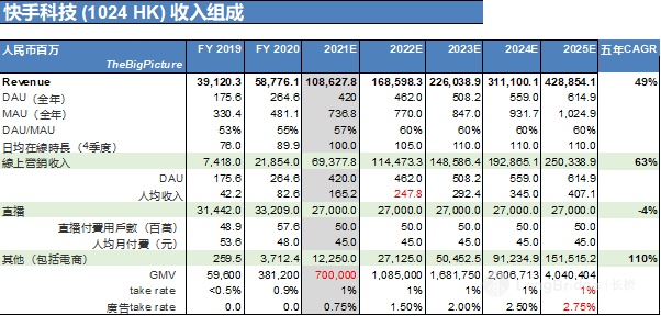 GMV2021 年用的是公司的 6-7 月的投资者见面会交流数据,7000 亿的 GMV 高于 IPO 时的电商 GMV 目标(5000-6000 亿),其后 GMV 增速与行业一致 55%,佣金率维持 1%,广告 take rate 在 2025 年逐步达到抖音现在的水平 2.75%。