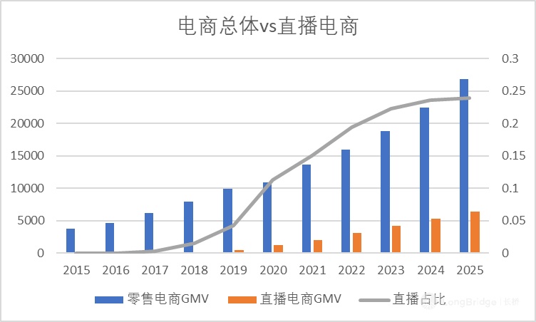 中国零售电商总体 GMV 在 2025 年将达到 26.8 万亿,其中直播电商 GMV 达到 6.4 万亿。总体 GMV 的 CAGR 在 2025 年前是 18.1%,电商直播 GMV 的 CAGR 达到 57.7%。直播电商占比一路提升,在 2025 年达到 24%。我认为远期份额直播电商可以达到 30% 以上。