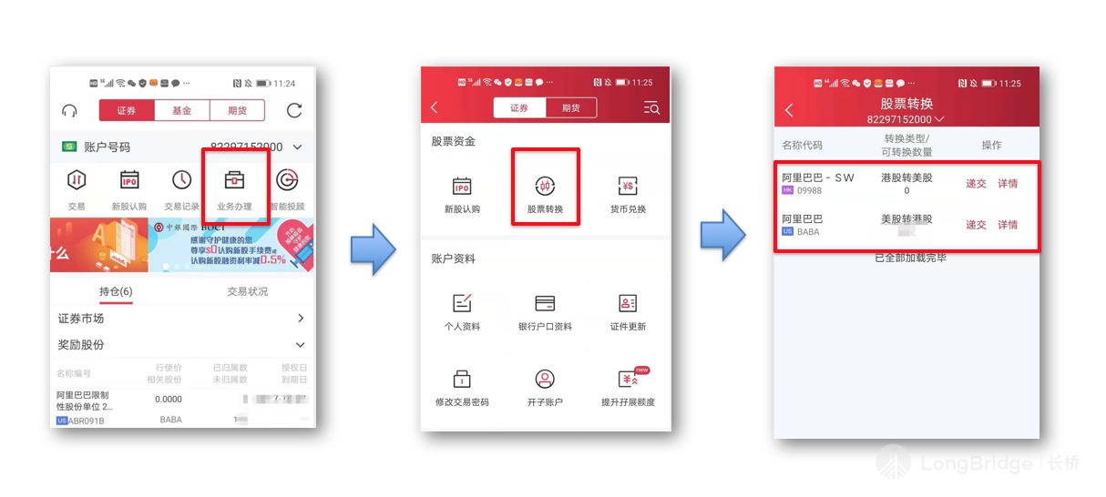 原则上,你的股票可以在任何券商都可以按照 1:8 比例从美股转成港股,但是最最合适的是在中银转哦,因为中银对于阿里这项业务是免费的,普通的券商每次操作需要 100 美金 +。这是我目前觉得中银在各种毛病之上,还算可以夸赞一般的功能。接下来简单用图说明一下如何操作。