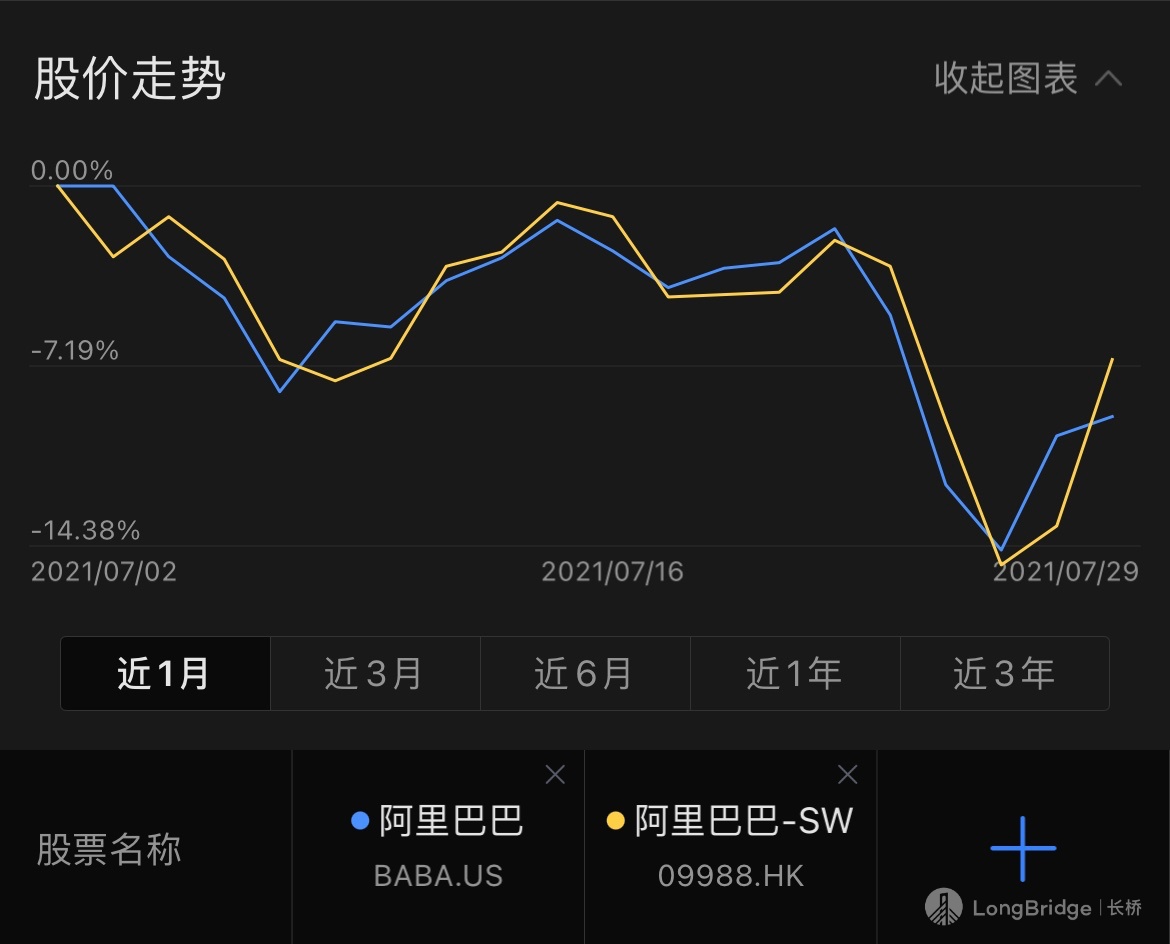 我想大家肯定是最关心,就是到底持有美股还是持有港股更获得更好收益,从这点上来,答案是基本阿里美股的股价和港股的股价是严格绑定的,基本不会有什么差异,顶多随汇率有一定波动(港币基本上是锚定美金,所以差异也很小),但是资本追逐利益的速度快得让你难以想象,所以不会给你留下什么套利空间的。可以看下图拿到答案。