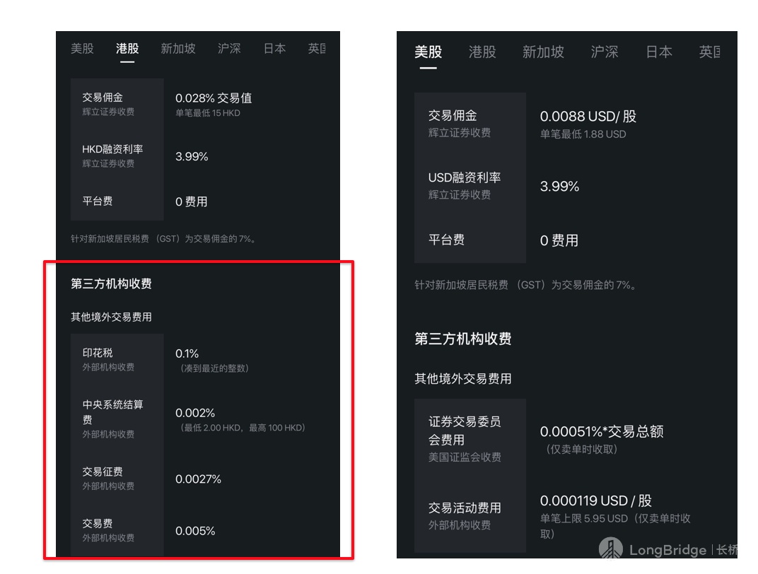 结论:美股的交易费用远低于港股。这是因为香港印花税等奇高(如下图所示),在全世界基本都在降低交易费用时候,他依然在提高费用。另外美股是以股数计算佣金,港股是以价格计算佣金,所以对于阿里这样股价比较高的股票,美股佣金就更有优势。以交易同样额度的阿里股票(100 股每股/800 股港股为例子,初略计算,不精确),大概有十倍的关系。