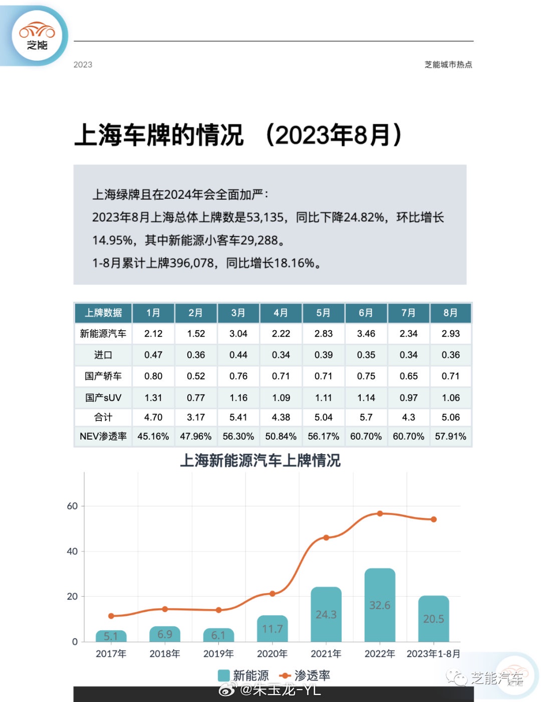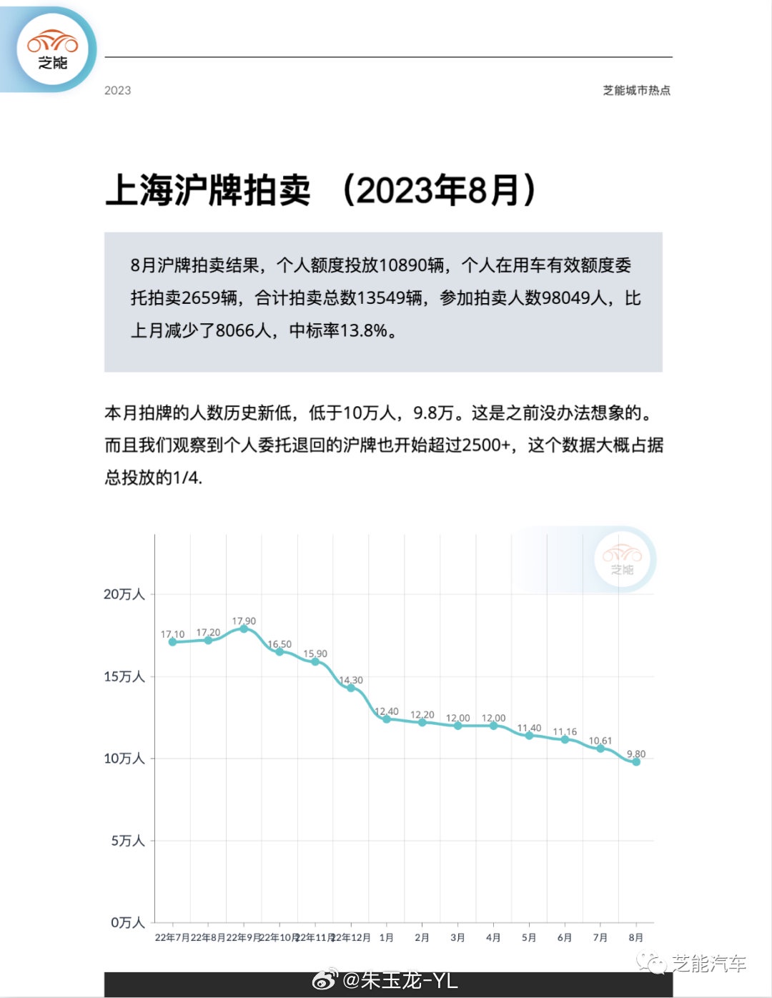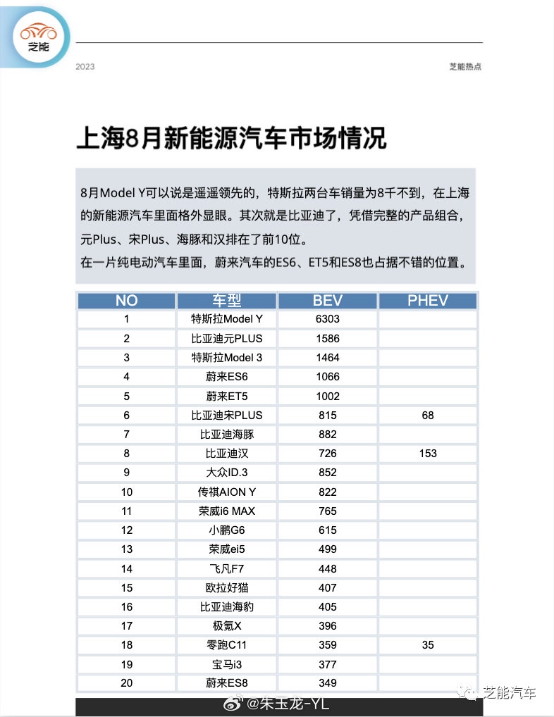 这篇文章主要来写一写大城市的情况,从新能源汽车全国达到 1/3 甚至于 40% 接近,大城市的上牌福利会结束的更快。上海新能源车上牌情况● 上海绿牌政策在 2024 年会全面加严2023 年 8 月上海总体上牌数是 53,135,同比下降 24.82%,环比增长 14.95%,其中新能源小客车 29,288。1-8 月累计上牌 396,078,同比增长 18.16%。目前上海的月度数据已经持续在 3 万左右,渗透率接近了 60%。图片8 月沪牌拍卖结果,个人额度投放 10890 辆,个人在用车有效额度委托拍卖 2659 辆,合计拍卖总数 13549 辆,参加拍卖人数 98049 人,比上月减少了 8066 人,中标率 13.8%。本月拍牌的人数历史新低,低于 10 万人,9.8 万。这是之前没办法想象的。而且我们观察到个人委托退回的沪牌也开始超过 2500+,这个数据大概占据总投放的 1/4.8 月 Model Y 可以说是遥遥领先的,特斯拉两台车销量为 8 千不到,在上海的新能源汽车里面格外显眼。其次就是比亚迪了,凭借完整的产品组合,元 Plus、宋 Plus、海豚和汉排在了前 10 位。在一片纯电动汽车里面,蔚来汽车的 ES6、ET5 和 ES8 也占据不错的位置。The copyright of this article belongs to the original author/organization.