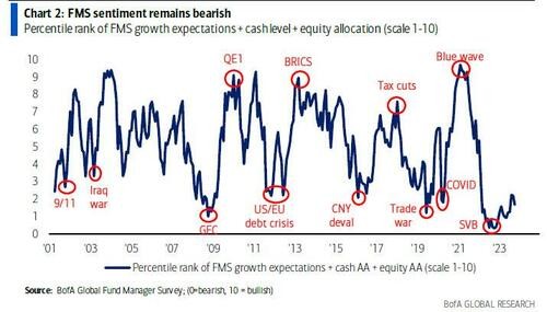 259 位受访的基金经理对经济增长的预期仍然悲观,50% 的人预计未来 12 个月全球经济将走弱(9 月为与 53%)。对经济硬着陆的担忧正在上升,从 9 月份的 21% 上升到 10 月的 30%。与此同时,仍然有 59% 的投资者认为美国经济可以实现软着陆。