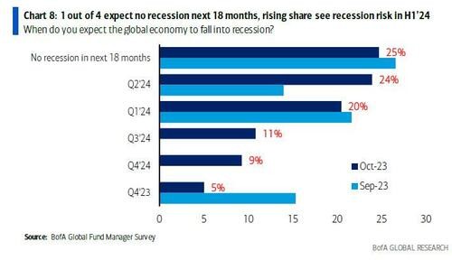 1/4 受访者表示,未来 18 个月内将出现经济衰退,但预计 24 年上半年将出现经济衰退的投资者比例仍在上升,44% 的投资者预计全球经济将在 24 年第一季度或第二季度陷入衰退。