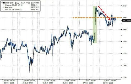 地緣政治風險仍是金價的主要推動力。上週五,以色列對進入加沙地帶的哈馬斯發動地面進攻,推動金價一舉突破 2000 美元大關。然而,鑑於週末以色列的攻勢並沒有預期的那麼猛烈,週一盤初金價轉跌,最終收跌 0.42%,報 1997.6 美元,仍離五個月高位不遠。