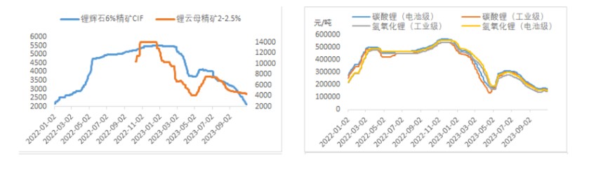 今年第三季度,電池級碳酸鋰和氫氧化鋰的價格分別從季初的 30.6 萬元/噸和 27.2 萬元/噸降至季末的 17.85 萬元/噸和 17.2 萬元/噸,降幅高達 41.7% 和 36.8%;而與此同時,鋰精礦(6% 品味)的價格僅從 4015 美元/噸降至 2850 美元/噸,降幅只有 29%。