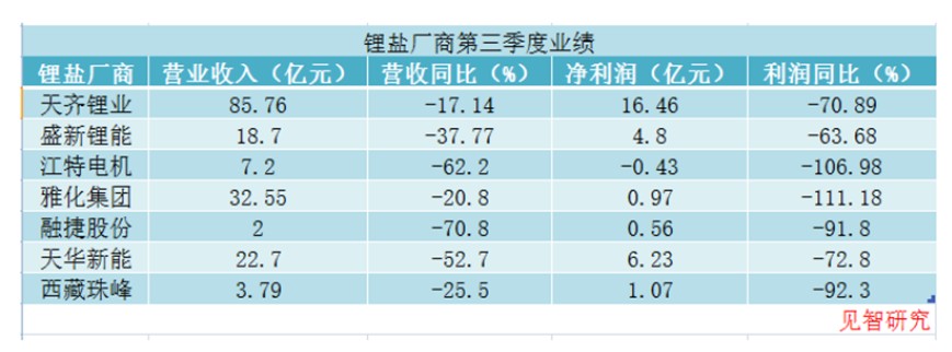 今年第三季度,包括贛鋒鋰業在內的大多數鋰鹽廠商都出現盈利下滑。以國內上市的主要鋰鹽廠商為例,第三季度他們的利潤和營業收入都急劇減少,且短期內這種趨勢難以改變。
