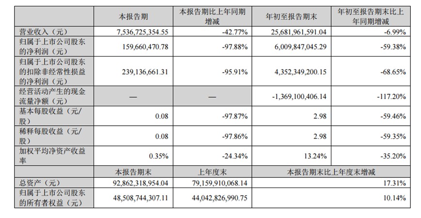 10 月 30 日晚,贛鋒鋰業公佈了自己的 2023 年三季度業績。今年第三季度,贛鋒鋰業的營業收入達到 75.37 億元,同比降低 42.77%,環比降低 13.44%;歸母淨利潤達到 1.6 億元,同比降低 97.88%,環比減少 95.38%。毛利率則是從同期的 50.86% 減少 45.92 個百分點到 4.94%,淨利率也從此前的 58% 降低到 0.43%,減少了 57.57 個百分點。