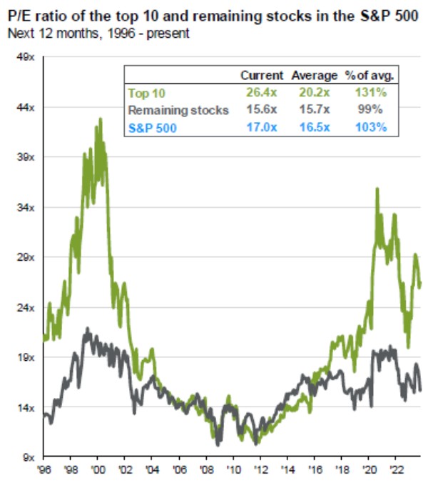 標普 500 指數已從 7 月份的峯值下跌了 10%,該指數成份股公司第三季度利潤有望增長 2.1%,這使得該指數的市盈率接近 20 倍,而長期平均市盈率超過 16 倍。除去 10 家最大的公司 (大多是大型科技公司),市盈率為 15.6 倍。這 10 只重量級股票的總市值是預期收益的 26 倍,比它們的長期平均市盈率水平高出約 131%。