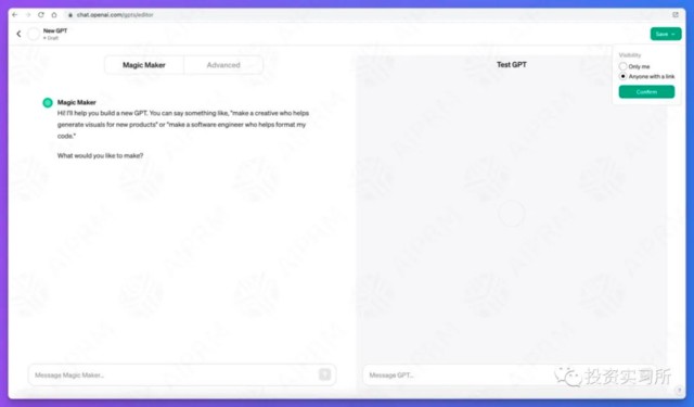 而且,對於創建的 GPT,你可以將其公開分享給其它任何人,也可以僅僅供自己使用。