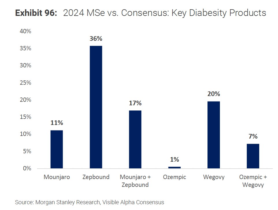 我們對兩家公司主要的 GLP-1 藥物 2024 年預測顯示,禮來的 Mounjaro/Zepbound 銷量將超出普遍預期共識。諾和諾德已經在主動減少 Wegovy 和 Ozempic 起始劑量的供應,我們預計的 2024 年 Wegovy 的供應鏈將大幅增強,諾和諾德 2024 年收入將實現 30% 的增長。