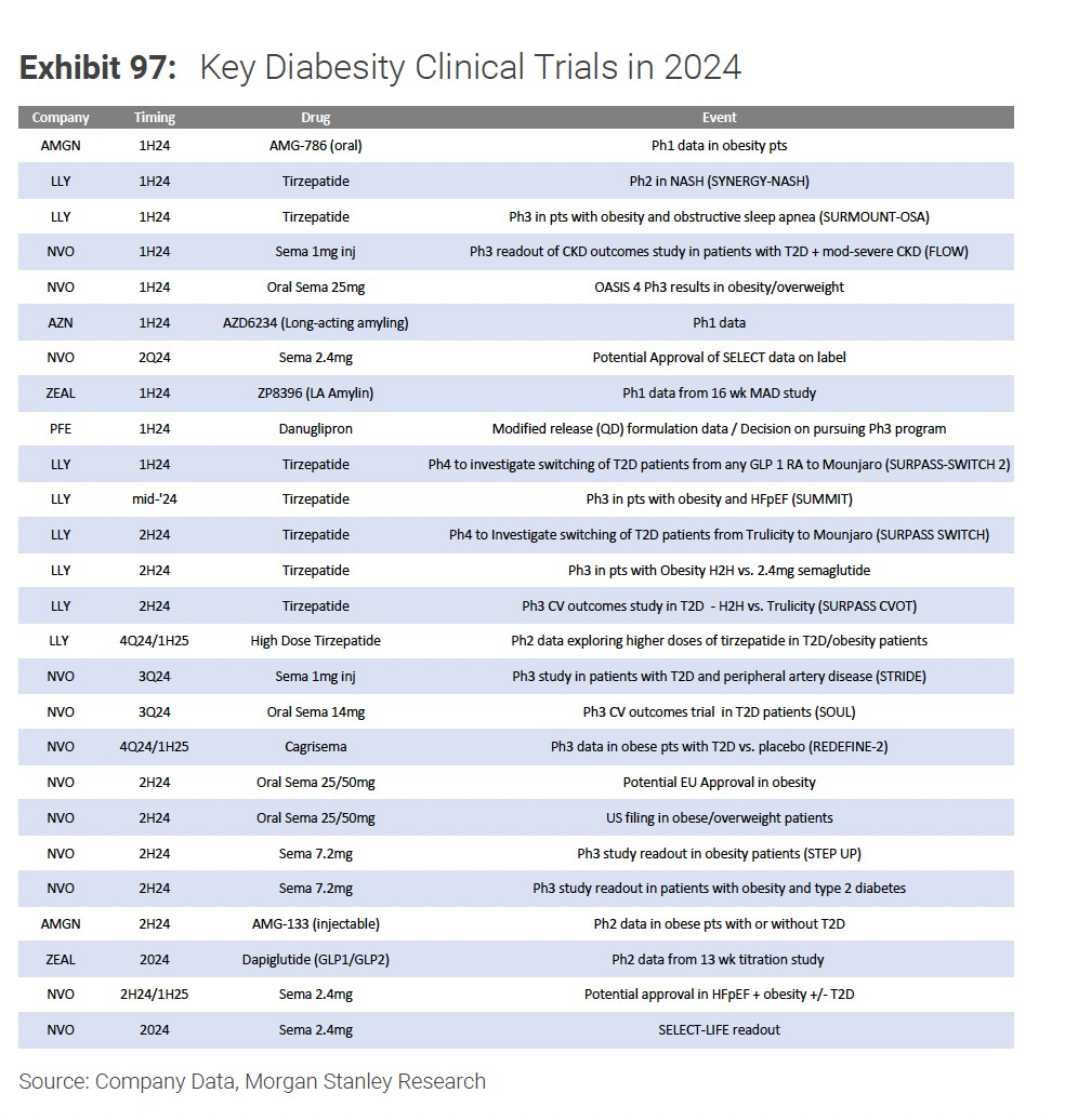大摩在報告中指出,他們時刻關注着諾和諾德及禮來的潛在競爭對手們的表現,但預計這些公司的臨牀試驗結果不會超過諾和諾德和禮來達到的標準,未來一年可能對肥胖症藥物市場產生影響的幾個關鍵事件: