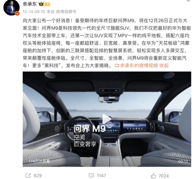 而殺傷力最大的無疑是問界。12 月 14 日,隨着餘承東在微博宣佈問界 M9 的上市時間,避開華為聲量的 26 日之後的時間,就成為各家車企爭搶的節點。