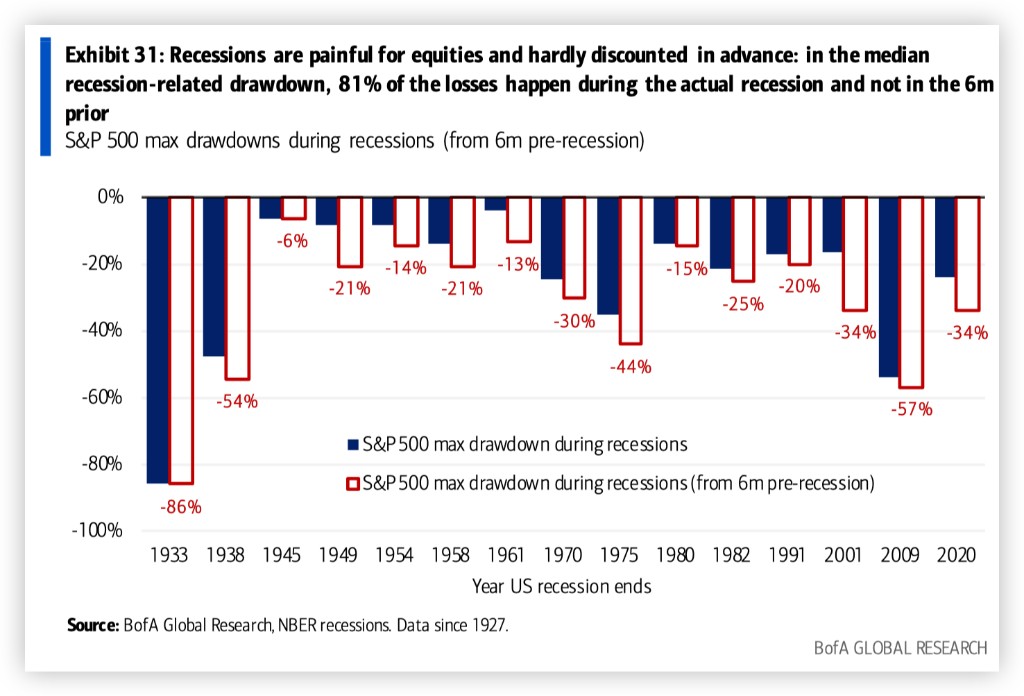 分析師表示,回顧過去 100 年的市場表現,衰退一旦發生,都會給市場帶來毀滅性打擊,而且很難提前預見:如下圖所示,在與經濟衰退相關的拋售中,81% 的虧損發生在實際的經濟衰退期間。