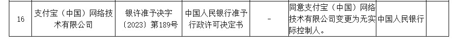智通財經 APP 獲悉,中國人民銀行網站公佈的非銀行支付機構重大事項變更許可信息公示(截至 2023 年 12 月)顯示,人民銀行同意支付寶(中國)網絡技術有限公司變更為無實際控制人。