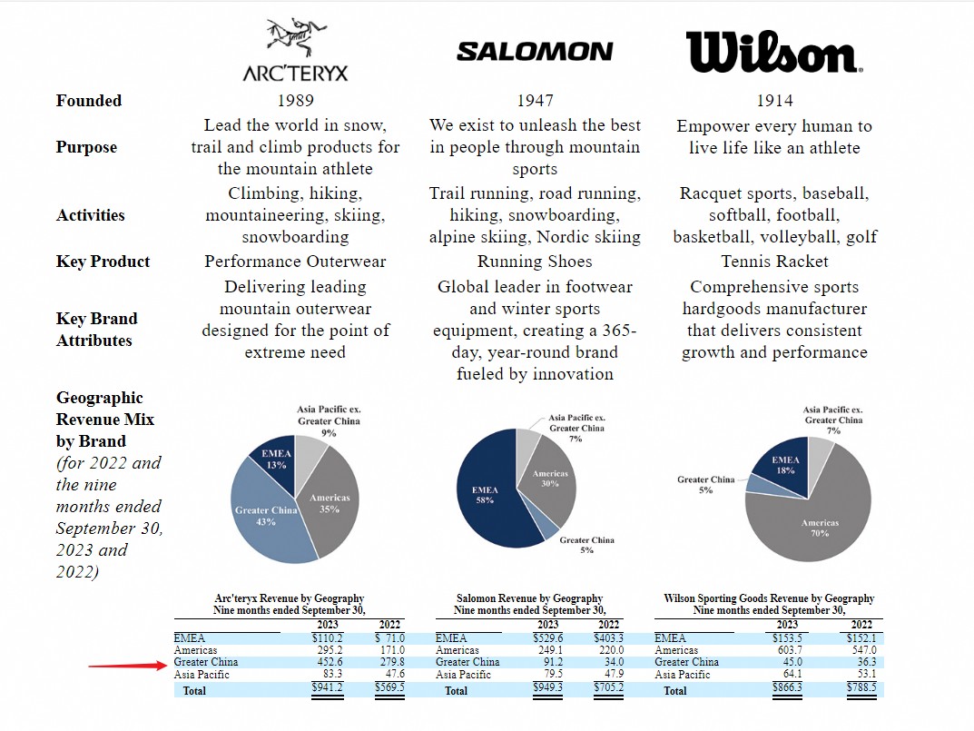 值得注意的是,大中華區已然是亞瑪芬體育營收增長最快的市場。從 2020 年到 2023 年三季度,亞瑪芬體育在大中華區的收入從 2.02 億增至 5.9 億美元,年複合增長率達 60.9%,收入佔比也從 8.3% 提高到 19.4%。