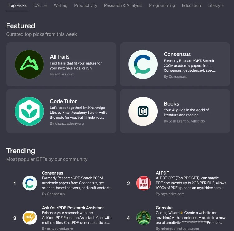 GPT 商店旨在推廣 GPT 並對其進行分類,讓用户更輕鬆地找到正在尋找的內容,或是發現用户甚至不知道自己想要的內容。GPT 商店包括基於下載流行度的社區排行榜,使用的人越多,產品的排名就越高。用户還可以按類別搜索,例如寫作、生活方式、教育等類別。