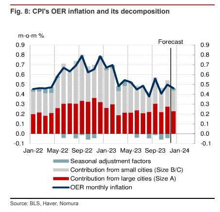 瑞银也指出,租金和 OER 将再次强劲增长,大致与过去六个月的平均水平一致,并预计租金至少在 3 月份前会上涨 40 到 50 个基点。野村认为,租金和 OER 通胀将略微下降,但其同时也指出下降过程较为缓慢。