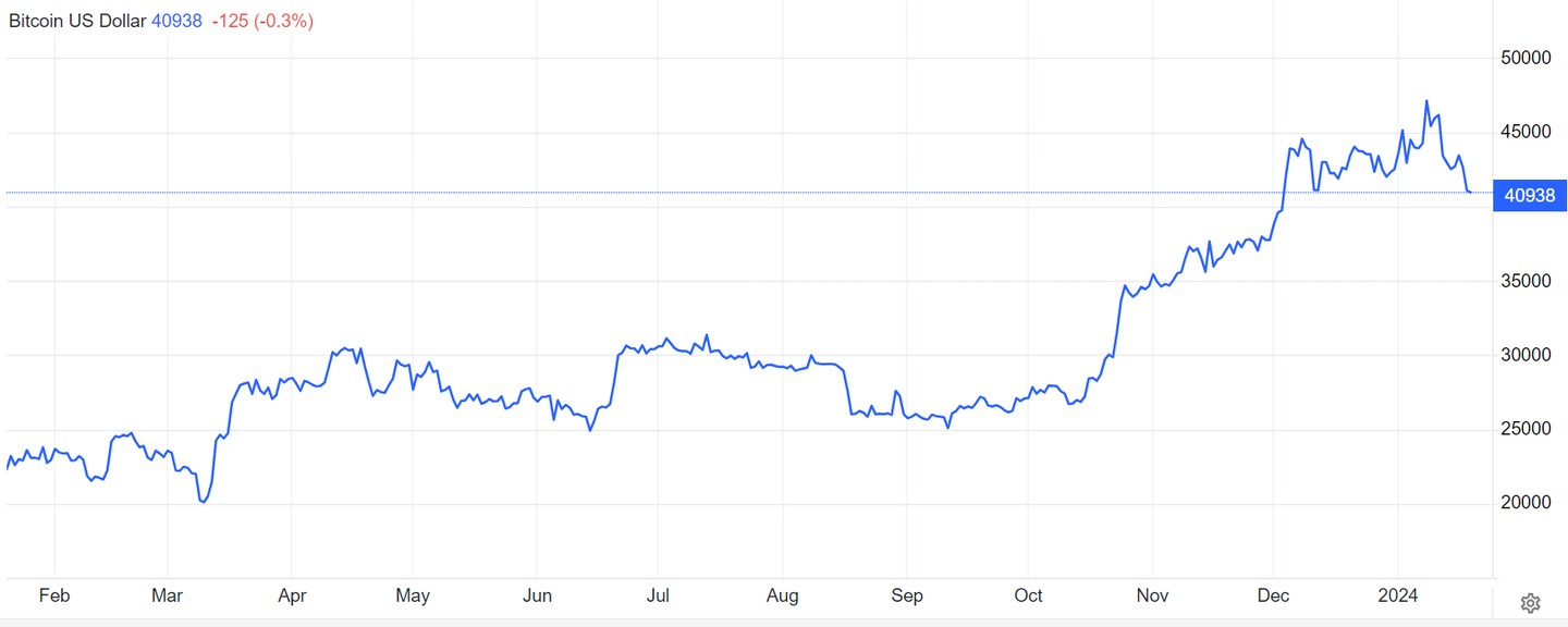 然而自 1 月 11 日以來,比特幣價格在 “買預期賣事實” 的這種獲利了結情緒之中已經下跌超 8%。由於市場自 2023 年年末以來一直預期 ETF 最終會得到 SEC 的正式批准,比特幣近幾個月在這種呼聲中持續暴漲,從 10 月份的不到 3 萬美元漲至如今的 4.1 萬美元。