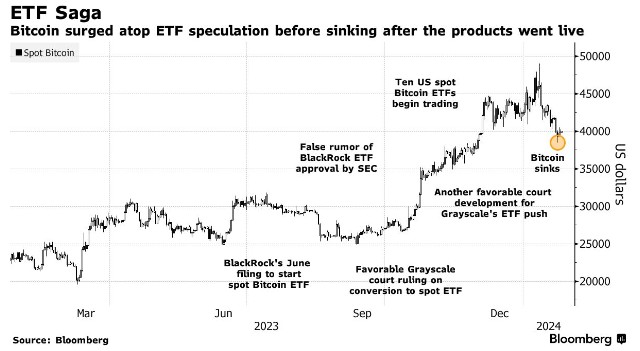 1 月 11 日,比特幣觸及 49,021 美元的盤中高點,隨後在本週早些時候跌至 38,510 美元的低點。在 2021 年大流行時期的加密貨幣狂熱期間,它創下了近 6.9 萬美元的歷史新高。
