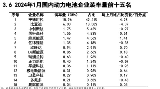 為完成 300 萬輛銷量目標的比亞迪,通過實施降價促銷的方式在 2023 年 12 月透支了部分 2024 年 1 月的需求,導致 1 月的新能源汽車銷量只有 20.1 萬輛,雖然同比依舊保持些許增長 33.9%,但是環比大幅度下滑了 41%。所以,比亞迪 1 月的動力電池裝機量只有 6GWh,市場份額環比下滑 4.37 個百分點,同比下滑 15.54 個百分點至 18.68%。