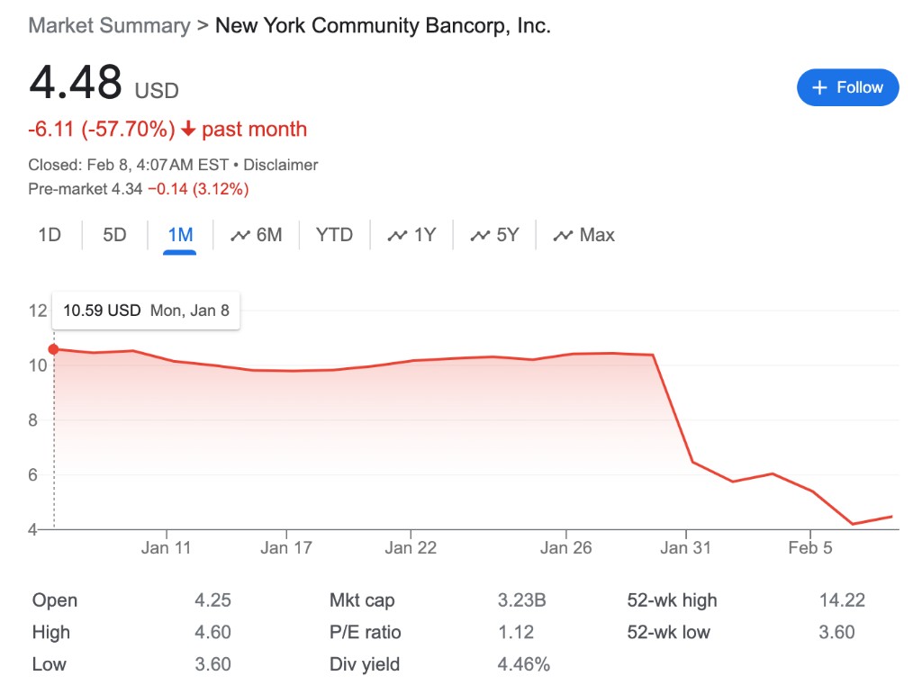 自上週公佈的去年第四季度財報意外虧損以來,紐約社區銀行股價已經蒸發了 50% 以上。