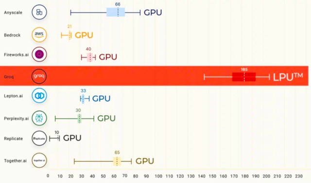 根據其模型的首次公開基準測試結果,Groq 雲服務搭載的 Llama2 或 Mistreal 模型在計算和響應速度上遠超 ChatGPT。這一卓越性能的背後,是 Groq 團隊為大語言模型(LLM)量身定製的專用芯片(ASIC),它使得 Groq 每秒可以生成高達 500 個 token。相比之下,目前 ChatGPT-3.5 的公開版本每秒只能生成大約 40 個 token。