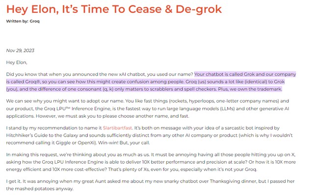 雖然今天才刷屏,但 Groq 公司並非初出茅廬的新創企業。實際上,該公司成立於 2016 年,並在那時就註冊了 Groq 商標。去年 11 月,當馬斯克發佈人工智能模型 Grok 時,Groq 公司的開發者們就發了一篇文章説馬斯克撞名自己的公司。信寫的挺逗的,但這波流量他們是一點沒吃到。
