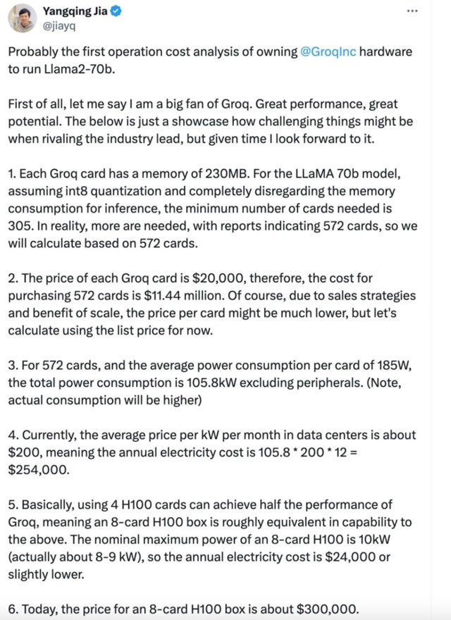 賈揚清在推特上算了一筆賬,因為 Groq 小的可憐的內存容量(230MB),在運行 Llama-2 70b 模型時,需要 305 張 Groq 卡才足夠,而用 H100 則只需要 8 張卡。從目前的價格來看,這意味着在同等吞吐量下,Groq 的硬件成本是 H100 的 40 倍,能耗成本是 10 倍。