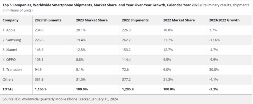 在 2023 年出貨量 TOP5 品牌中,傳音與蘋果是唯二正增長的品牌,分別同比增長 30.8% 和 3.7%。
