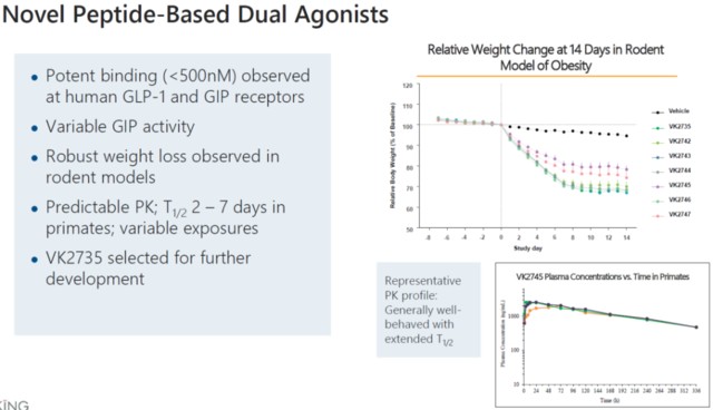 Viking 設計了不同 GIP 活性的分子組合,最終篩選 VK2735 推進臨牀。