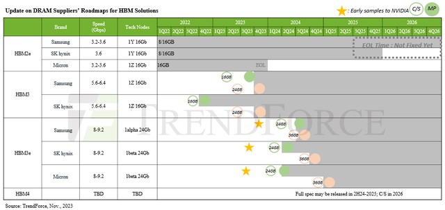我們還沒有看到關於 SK 海力士十六高 HBM3E 內存的介紹,也不知道它什麼時候上市。去年 8 月,SK 海力士展示了第五代 HBM 內存和第一代 HBM3E 內存,據稱每個堆棧可提供 1.15 TB/秒的帶寬。正如下面由 Trendforce 創建的 HBM 路線圖所示,我們的預期是提供 24 GB 和 36 GB 容量,這意味着 8 高堆棧和 12 高堆棧。