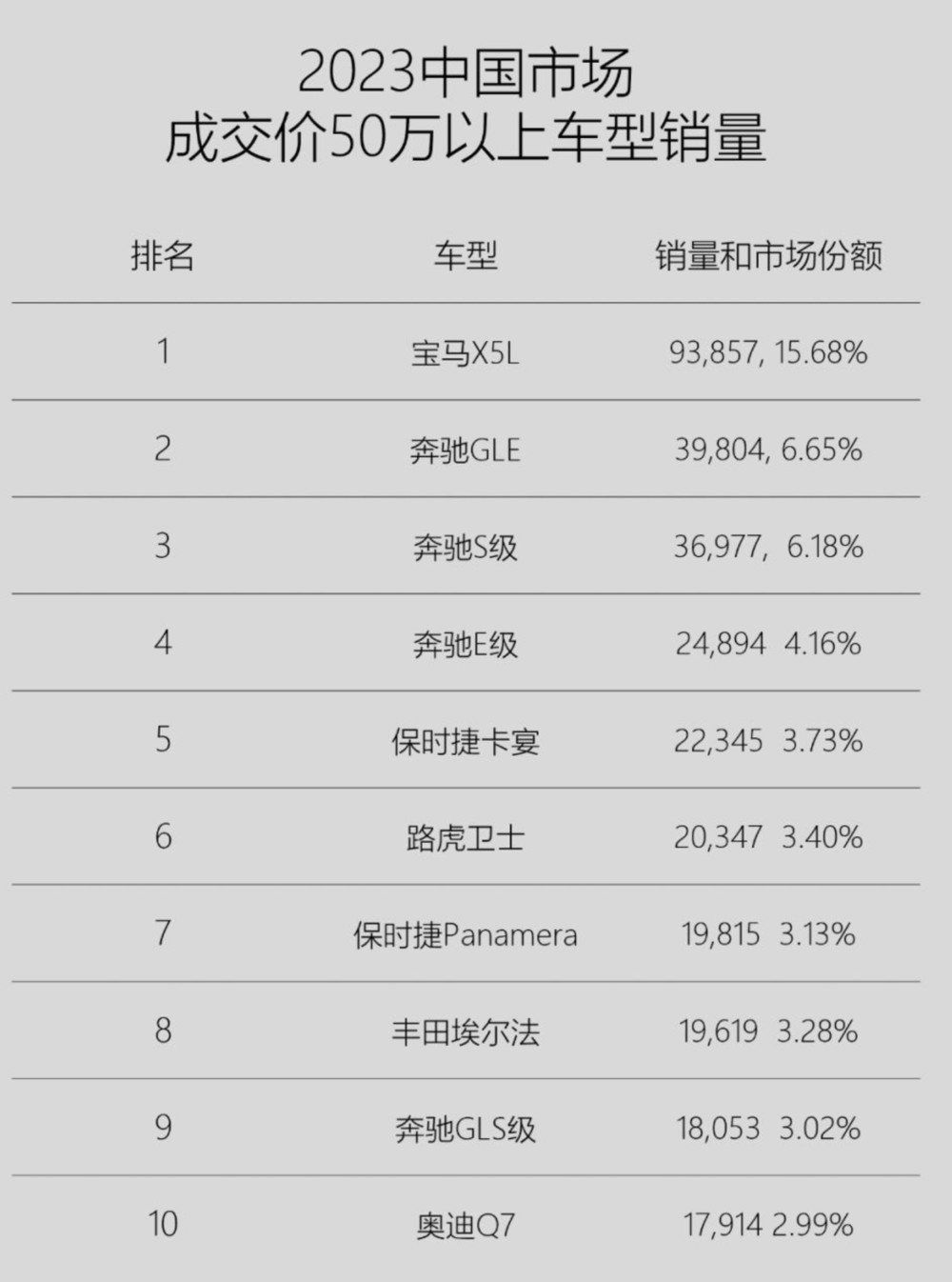 這是什麼概念?在 2023 年全年,我國成交價 50 萬元以上的新車銷量榜單是這樣的:
