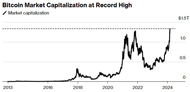 比特幣的價格逼近歷史新高。但從市場價值來看,該代幣已經創下了紀錄。CoinGecko 的數據顯示,比特幣的市值達到 1.35 萬億美元,超過了 2021 年 11 月 1.28 萬億美元的峯值——當時,該代幣在疫情時期的牛市中飆升至 68991.85 美元。自那以來,比特幣的供應量一直在增長,在這種加密貨幣最近的反彈中,比特幣的市值達到了新的水平。截至發稿,該最大的數字資產在新加坡下跌 1% 至 66928 美元,早些時候一度漲到 68804 美元。