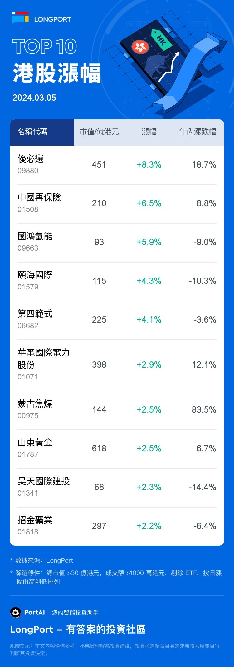 優必選 (09880) 涨 8.34%,成交额 5050.7 万港元,年内累计涨 18.7%。 中國再保險 (01508) 涨 6.45%,成交额 1293.8 万港元,年内累计涨 8.8%。 國鴻氫能 (09663) 涨 5.92%,成交额 1110.7 万港元,年内累计跌 9%。
