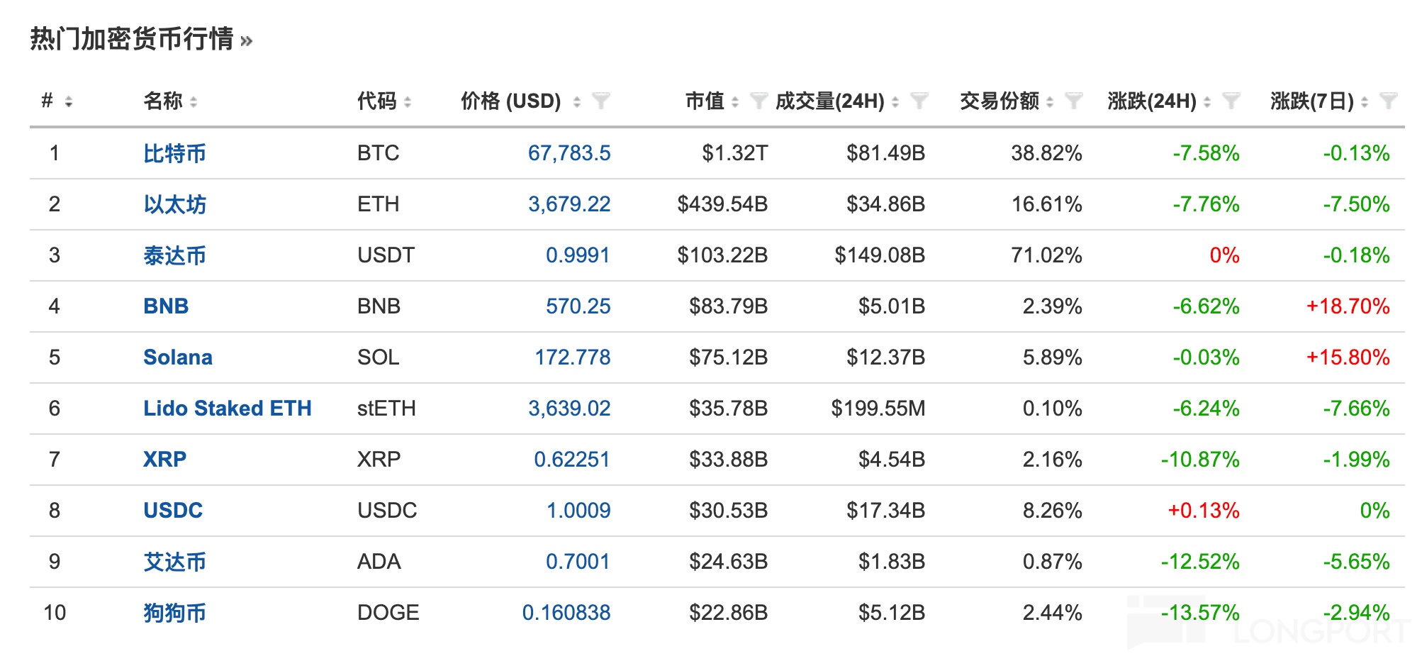 比特幣現報 67783 美元,24 小時跌超 7%;以太坊現報 3679 美元,24 小時跌超 7%。