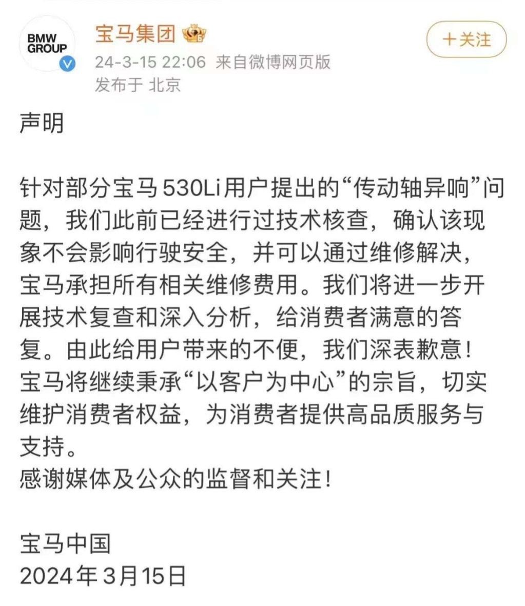 隨後,寶馬中國進一步表示,針對部分寶馬 530Li 用户提出的 “傳動軸異響” 問題,已經進行過技術核查,確認該現象不會影響行駛安全,並可以通過維修解決,寶馬將承擔所有相關維修費用。後續將展開進一步開展技術複查和深入分析。