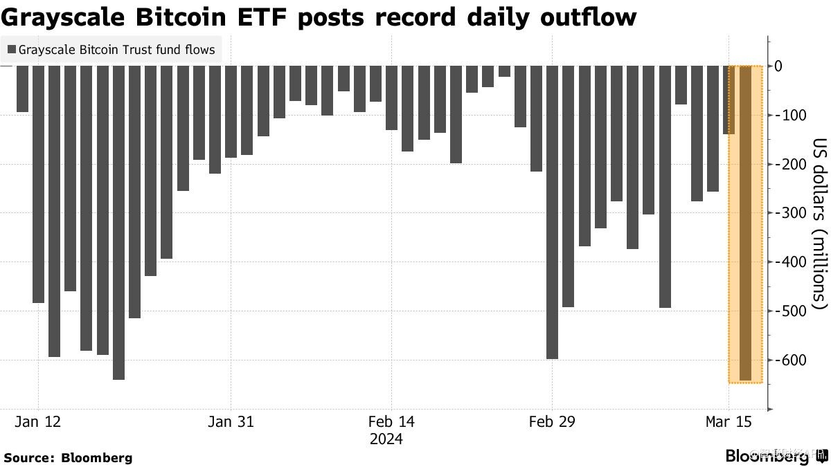 比特幣延續跌勢,導致全球最大的比特幣交易所交易基金流出創下記錄。規模為 250 億美元的灰度比特幣信託週一流出 6.43 億美元,是自 1 月 11 日轉換為 ETF 以來的最大流出量。此外,對新上市的現貨比特幣 ETF 的需求也在減少,資金流向富達和貝萊德等巨頭產品也減少。貨幣政策的不確定性和資產泡沫風險也令市場人士擔憂。比特幣價格下跌約 3%,至 65380 美元。