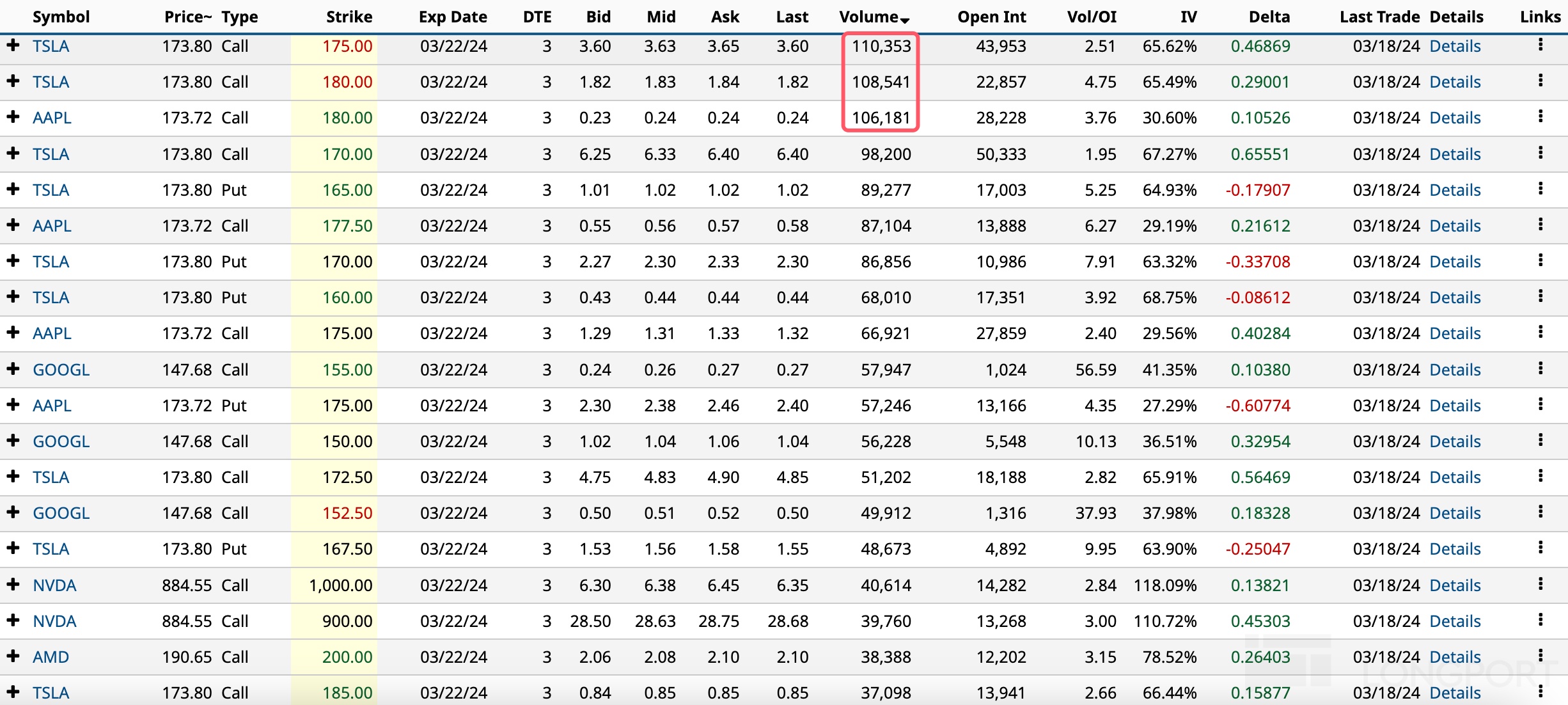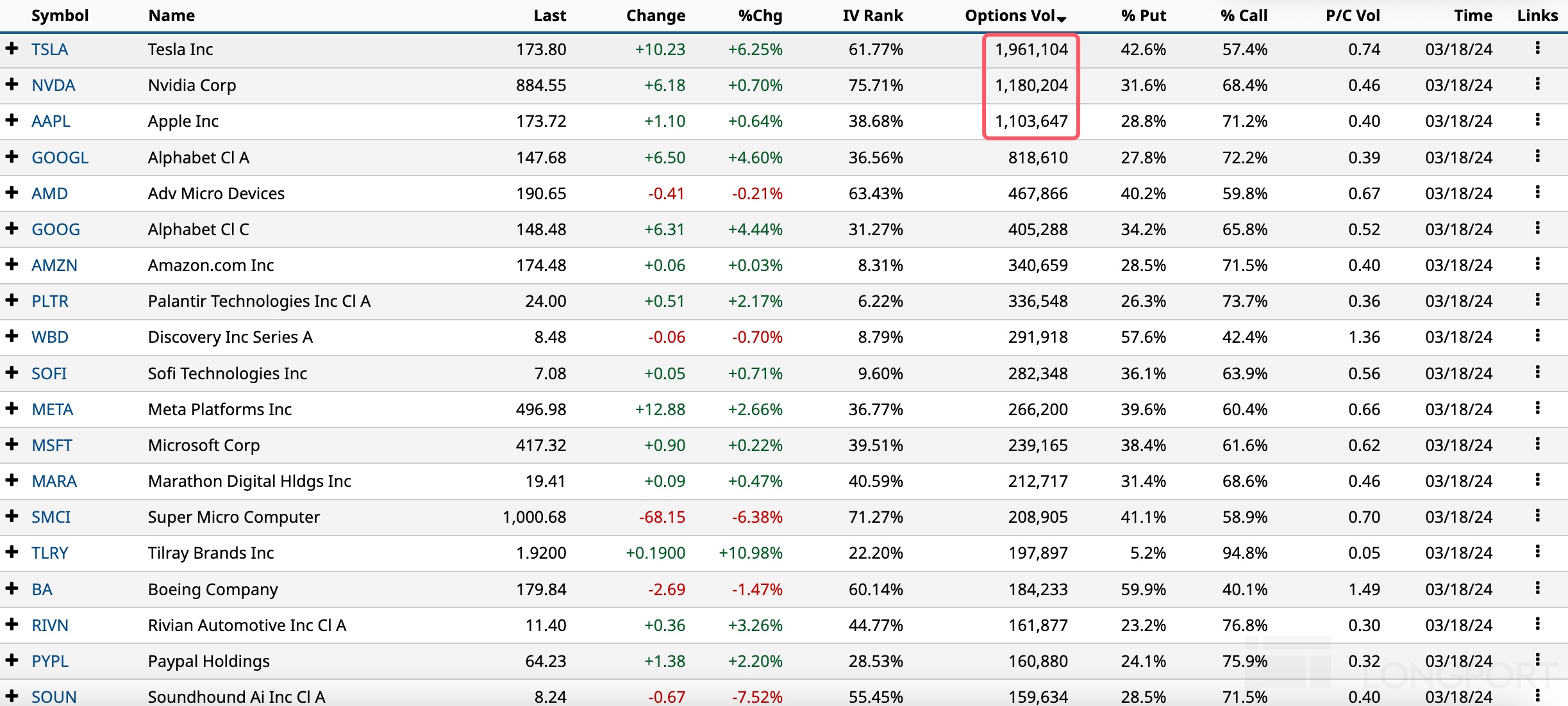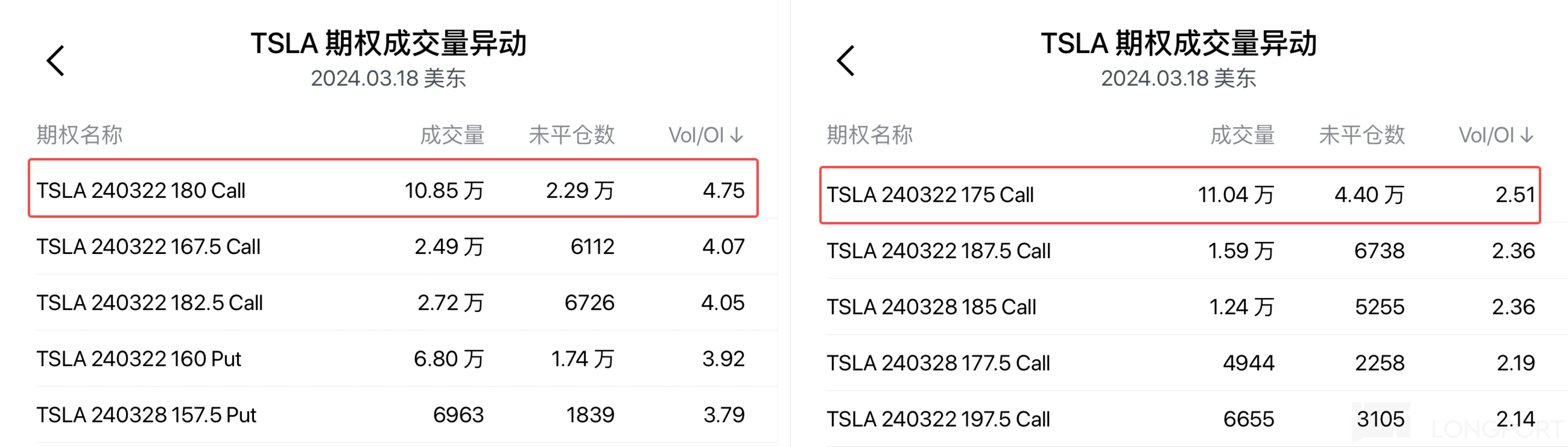 隔夜最火合約:3 月 22 日到期、執行價 175 美元的特斯拉 call,成交超 11 萬張!谷歌 A 期權成交暴漲至 82 萬張,看漲期權佔比 72%;谷歌 C 期權成交大漲至 40 萬張,看漲期權佔比 66%。